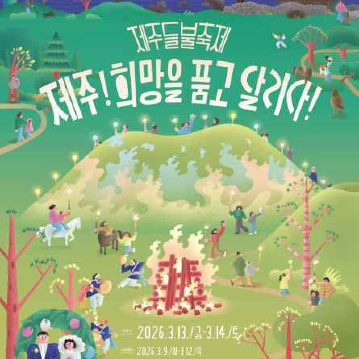 2026 제주들불축제는 2026년 3월 9일부터 14일까지 제주시 애월읍 새별오름 일원에서 개최된다. 3월 9일부터 12일까지는 사전행사로 소원지 쓰기, 상징 달집 만들기, 오름도슨트 프로그램이 운영되며 3월 13일부터 14일은 본행사로서
