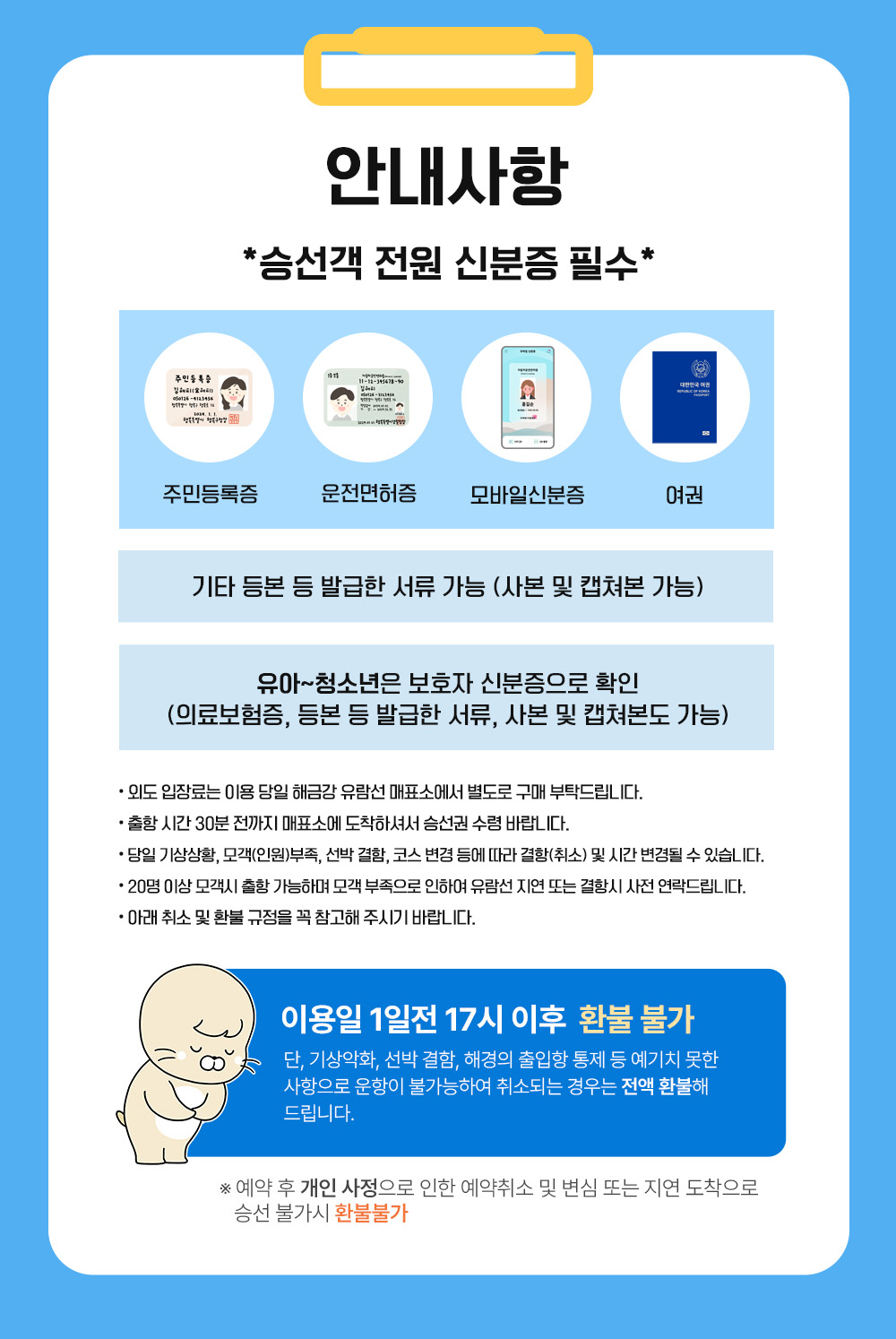 대기자가 많거나,승선절차가 지연될 경우 탑승을 못하실수 있으며,해당의 경우는 환불이 되지 않습니다.)